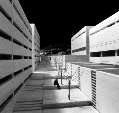 La implantación general de la propuesta valora las calles en sombra y organiza las viviendas consiguiendo una secuencia de lo público a lo privado. Se plantea, de este modo, una vivienda entre patios: patios-calles comunes y patios privados. Estos últimos, además de obtener la intimidad necesaria para conseguir un ambiente de estudio, harán que las viviendas (con una gran restricción de metros cuadrados) amplíen considerablemente su tamaño duplicando los espacios de estar.