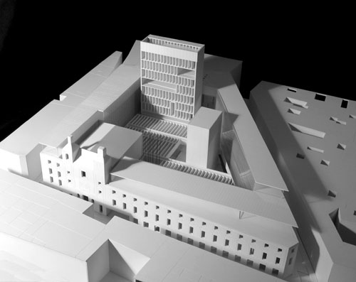 Se plantea una doble dialéctica: por un lado la dialéctica entre el recinto perimetral y el mundo interior; por otro lado, la dialéctica entre una cubierta que flota y un suelo escalonado, elementos horizontales a los que se contrapondrán las torres. El proyecto conformado en su exterior por las fachadas "conservadas" de las Escuelas Pías propone al interior un mundo de espacios libres y luz. Para alcanzar este interior se plantea una propuesta permeable con una secuencia concatenada de zaguanes y patios.